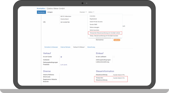 The advantage of our module is a temporary tax assignment that is linked to a validity period. Thus, vouchers with the correct taxes can be created for the tax reduction period without having to touch the basic setup of odoo.
