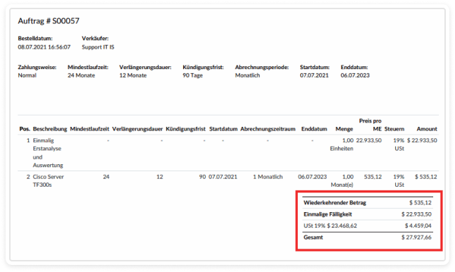 In the order, a distinction is made between recurring and one-time products or services. This way, it is immediately evident how the invoice amount is composed.